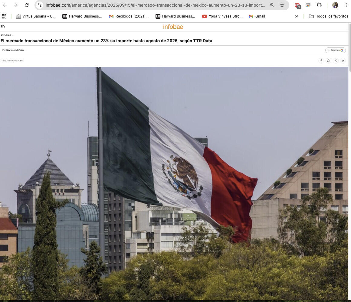 El mercado transaccional de México aumentó un 23% su importe hasta agosto de 2025, según TTR Data