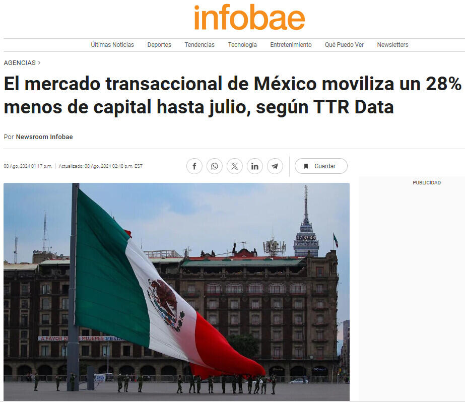 El mercado transaccional de México moviliza un 28% menos de capital hasta julio, según TTR Data