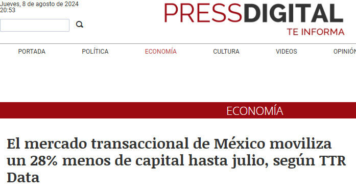 El mercado transaccional de México moviliza un 28% menos de capital hasta julio, según TTR Data