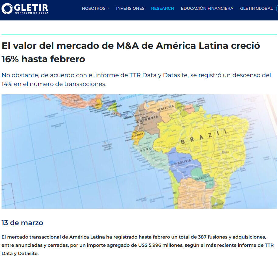 El mercado transaccional de América Latina ha registrado hasta febrero un total de 387 fusiones y adquisiciones, entre anunciadas y cerradas, por un importe agregado de US$ 5.996 millones, según el más reciente informe de TTR Data y Datasite.