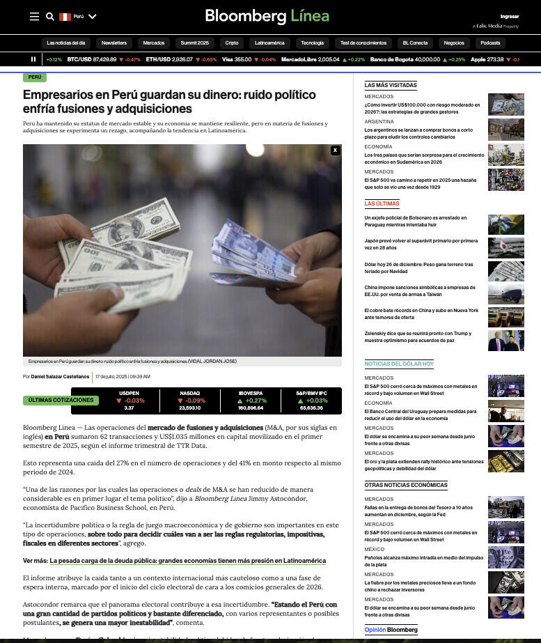 Empresarios en Perú guardan su dinero: ruido político enfría fusiones y adquisiciones