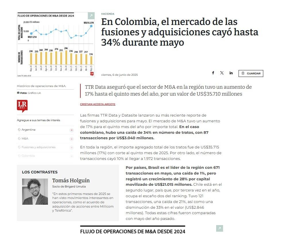 “En último lugar, Perú disminuye su actividad y registra 51 transacciones (un descenso de 28%), con un descenso de 62% en su valor (US$615 millones)”, se lee en el reporte de TTR. Tomás Holguín, socio de M&A de Brigard Urrutia, habló con TTR sobre los resultados de esta edición y aseguró que durante el periodo se han visto “movimientos interesantes en operaciones de montos considerables”.
