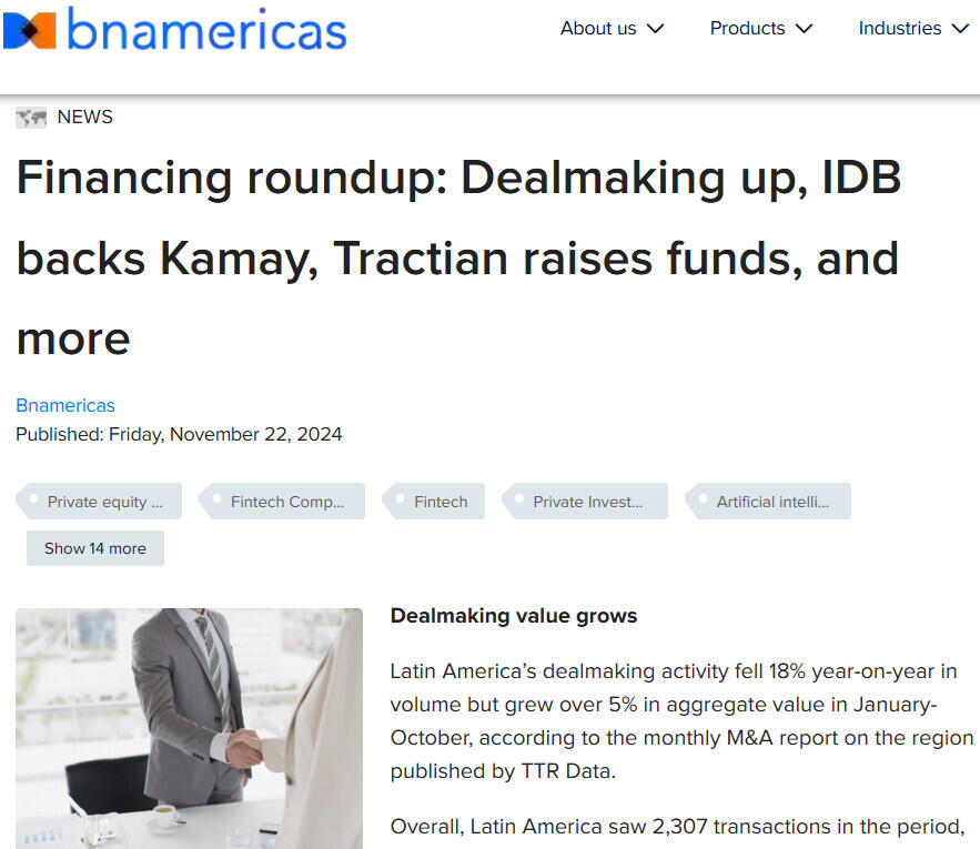 Financing roundup: Dealmaking up, IDB backs Kamay, Tractian raises funds, and more