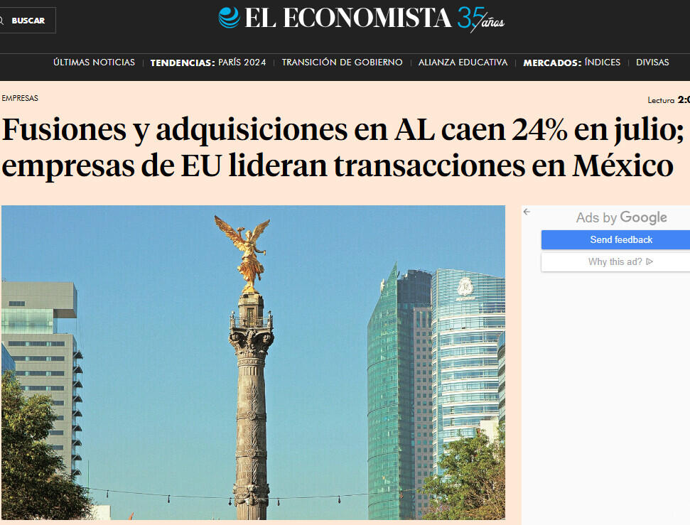 Fusiones y adquisiciones en AL caen 24% en julio; empresas de EU lideran transacciones en México