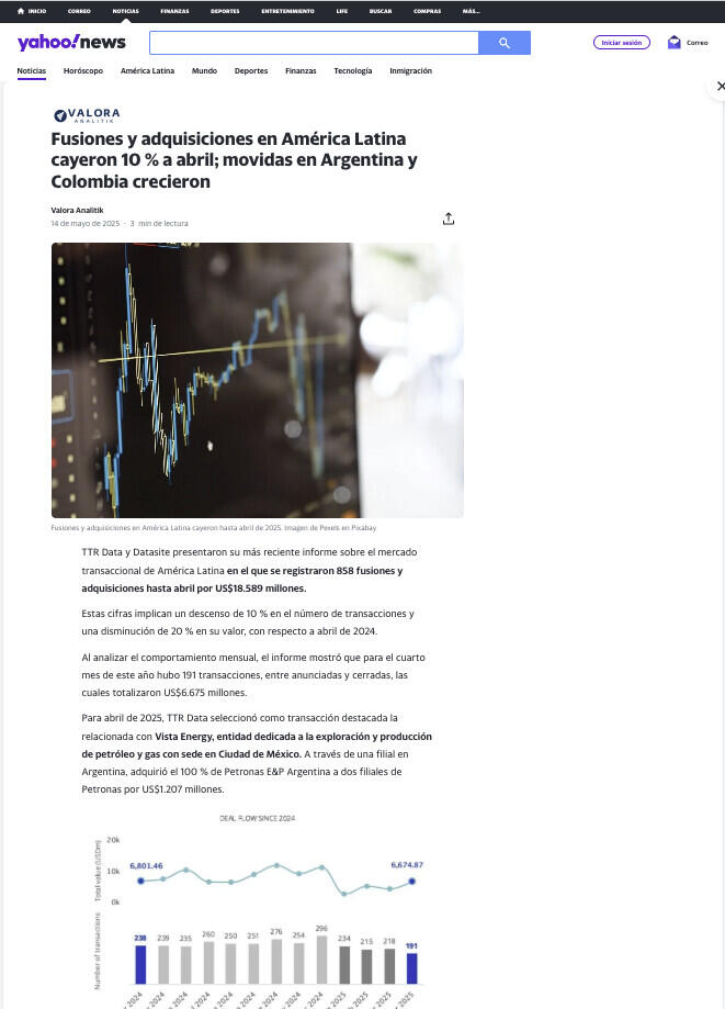 Para abril de 2025, TTR Data seleccionó como transacción destacada la relacionada con Vista Energy, entidad dedicada a la exploración y producción de petróleo y gas con sede en Ciudad de México. A través de una filial en Argentina, adquirió el 100 % de Petronas E&P Argentina a dos filiales de Petronas por US$1.207 millones.