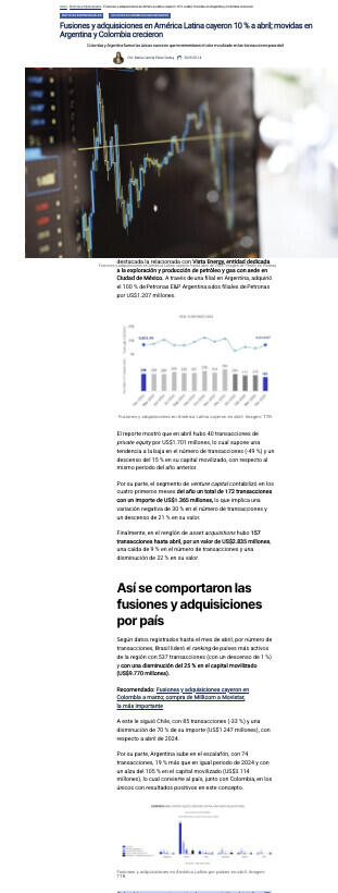 Fusiones y adquisiciones en América Latina cayeron 10 % a abril; movidas en Argentina y Colombia crecieron