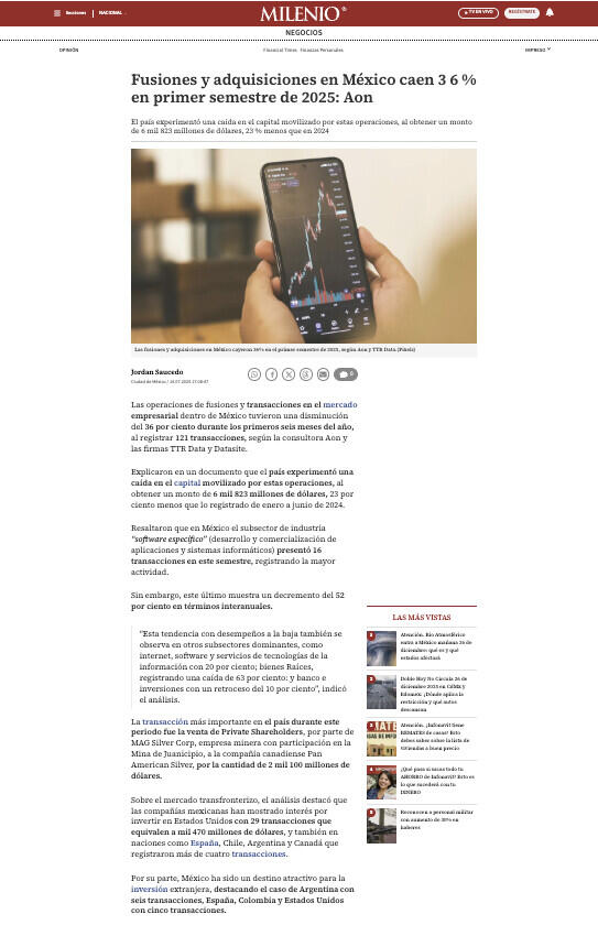 Fusiones y adquisiciones en México caen 3 6 % en primer semestre de 2025: Aon