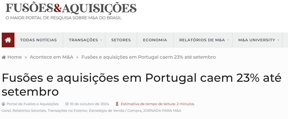 As fusões e aquisições (M&A – Mergers & Acquisitions) em Portugal continuam em queda em 2024. O mercado nacional de transações registra uma queda significativa no acumulado deste ano: menos 22,74% no capital mobilizado até setembro, comparativamente com os mesmos nove meses do ano passado, 8,462 bilhões de euros.