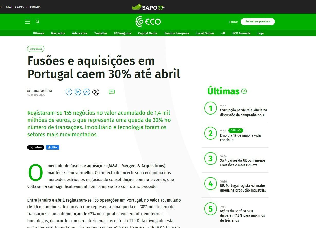 Entre janeiro e abril, registaram-se 155 operações em Portugal, no valor acumulado de 1,4 mil milhões de euros, o que representa uma queda de 30% no número de transações e uma diminuição de 62% no capital movimentado, em termos homólogos, de acordo com o relatório mais recente da TTR Data divulgado esta segunda-feira. Importa mencionar que apenas 41% das transações de M&A tiveram os valores publicados.