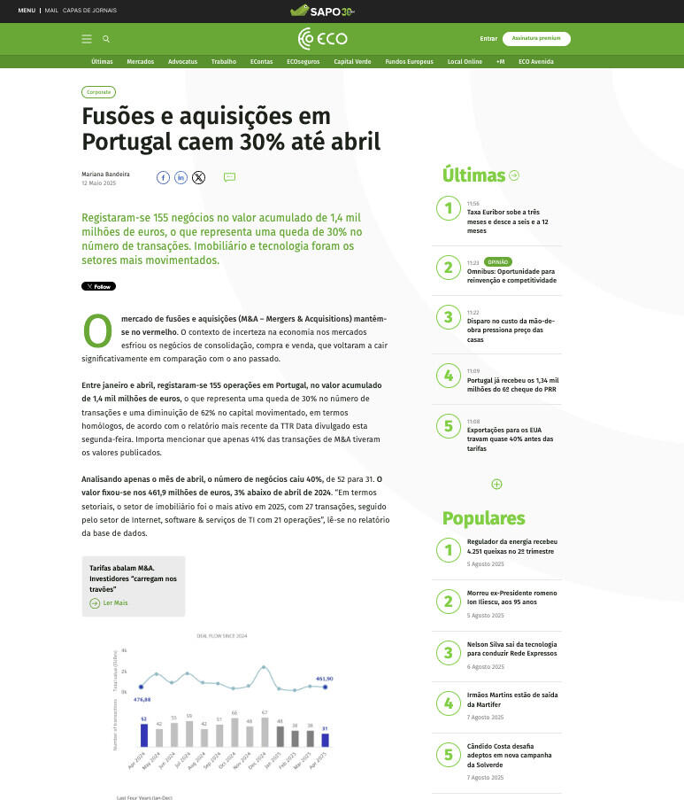 Entre janeiro e abril, registaram-se 155 operações em Portugal, no valor acumulado de 1,4 mil milhões de euros, o que representa uma queda de 30% no número de transações e uma diminuição de 62% no capital movimentado, em termos homólogos, de acordo com o relatório mais recente da TTR Data divulgado esta segunda-feira. Importa mencionar que apenas 41% das transações de M&A tiveram os valores publicados.