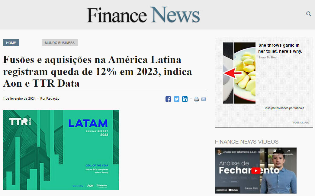 Fusões e aquisições na América Latina registram queda de 12% em 2023, indica Aon e TTR Data