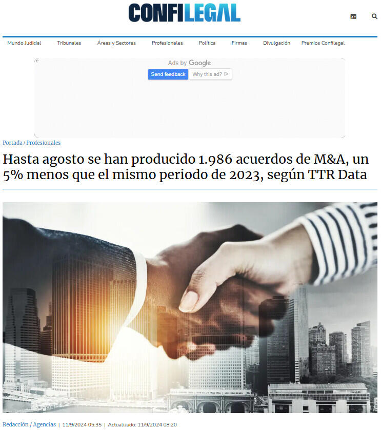 El mercado de fusiones y adquisiciones (M&A) en España ha experimentado un ligero descenso en el número de operaciones con 1.986 acuerdos hasta agosto de 2024, representando una caída del 5% respecto al año anterior.