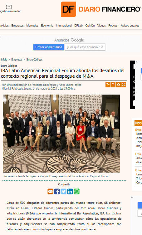 Cerca de 500 abogados de diferentes partes del mundo -entre ellos, 68 chilenos- están en Miami, Estados Unidos, participando del foro anual sobre fusiones y adquisiciones (M&A) que organiza la International Bar Association, IBA. Los tópicos que se están abordando en la conferencia demuestran cómo las operaciones de fusiones y adquisiciones se han complejizado, tanto si las contrapartes son latinoamericanas como si incluyen a empresas de otros continentes.