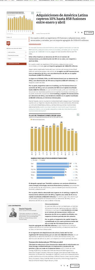 Según datos registrados hasta abril, por número de transacciones, Brasil lidera el ranking de países más activos de la región con 537 transacciones (con un descenso de 1%) y con una disminución de 25% en el capital movilizado (US$9.770 millones).