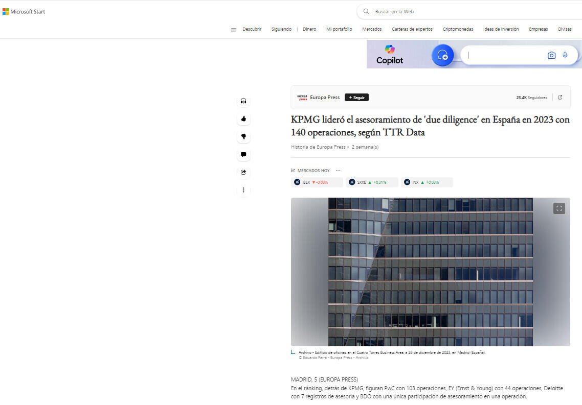 KPMG lideró el asesoramiento de 'due diligence' en España en 2023 con 140 operaciones, según TTR Data