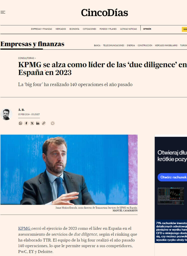 KPMG se alza como líder de las ‘due diligence’ en España en 2023