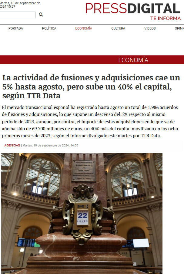 El mercado transaccional español ha registrado hasta agosto un total de 1.986 acuerdos de fusiones y adquisiciones, lo que supone un descenso del 5% respecto al mismo periodo de 2023, aunque, por contra, el importe de estas adquisiciones en lo que va de año ha sido de 69.700 millones de euros, un 40% más del capital movilizado en los ocho primeros meses de 2023, según el informe divulgado este martes por TTR Data.