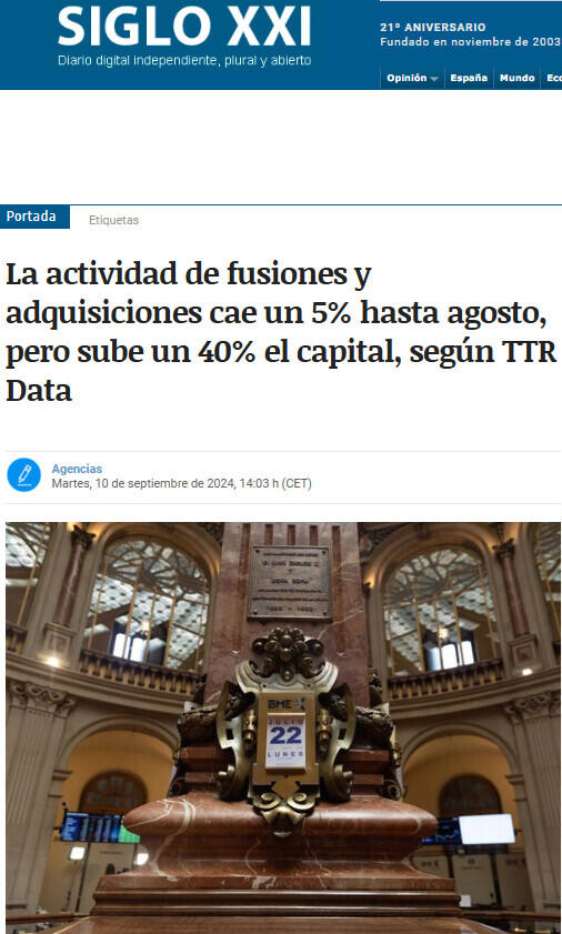 El mercado transaccional español ha registrado hasta agosto un total de 1.986 acuerdos de fusiones y adquisiciones, lo que supone un descenso del 5% respecto al mismo periodo de 2023, aunque, por contra, el importe de estas adquisiciones en lo que va de año ha sido de 69.700 millones de euros, un 40% más del capital movilizado en los ocho primeros meses de 2023, según el informe divulgado este martes por TTR Data.