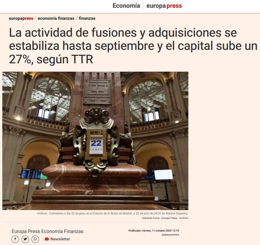 La actividad de fusiones y adquisiciones se estabiliza hasta septiembre y el capital sube un 27%, según TTR