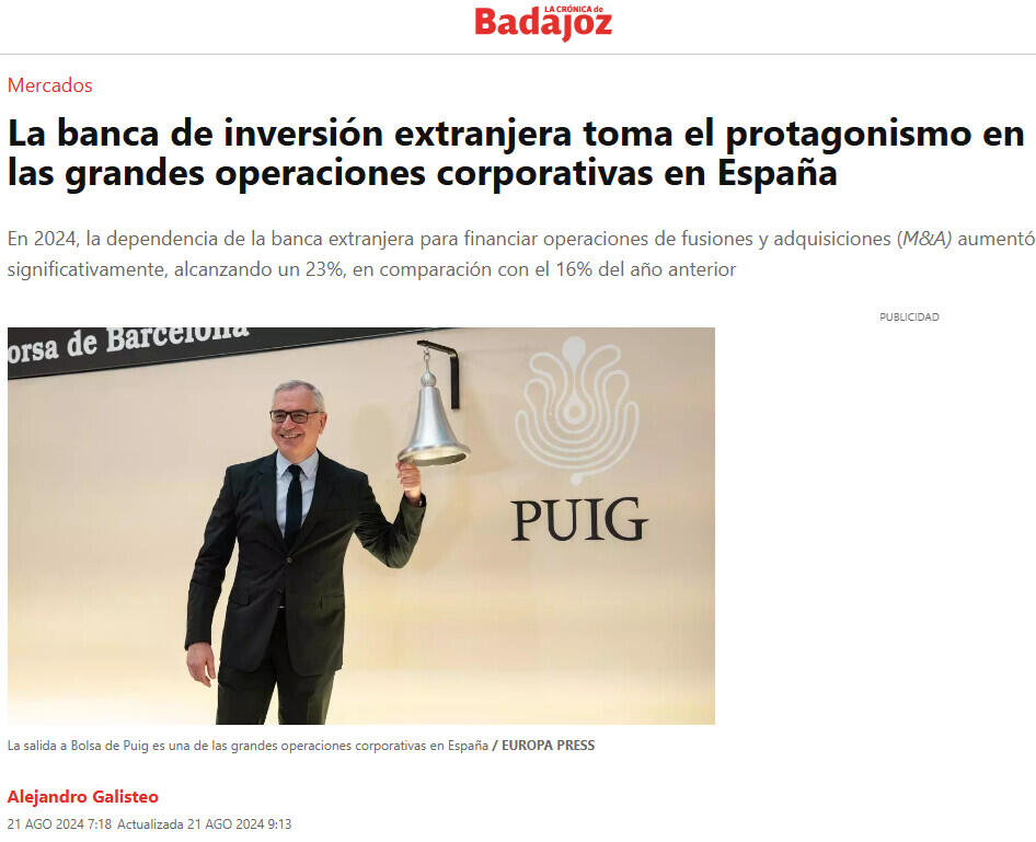 Por su parte, la plataforma de información sobre mercados Dealogic señala que en el segundo trimestre de 2024, los ingresos de los bancos de inversión en el mercado bursátil español se dispararon, alcanzando los 61 millones de euros, un incremento del 1.120% respecto al mismo período de 2023. Este aumento se debe principalmente a las operaciones de empresas como Puig, Cellnex y Sacyr, con Puig liderando la recaudación tras su salida a bolsa en mayo. La banca de inversión que más disparó sus beneficios obtuvieron llevaba DNI extranjero, con JPMorgan y Goldman Sachs como los principales beneficiados, llevándose la mayoría de las comisiones generadas en este periodo.