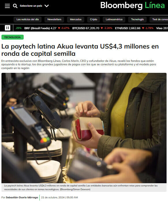 En entrevista exclusiva con Bloomberg Línea, Carlos Marín, CEO y cofundador de Akua, reveló los fondos que están apoyando a la startup, los dos grandes jugadores de pagos con los que se conectará su plataforma y el modelo para competir en la región
