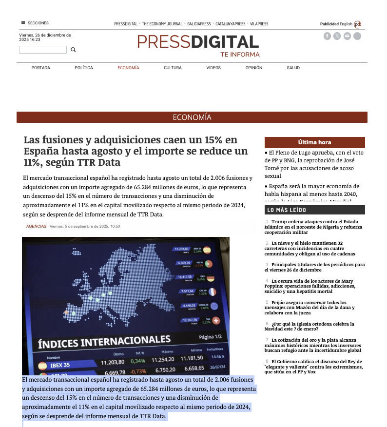 En agosto de 2025, TTR Data ha seleccionado como transacción destacada la adquisición de EYSA, empresa dedicada a la prestación de servicios de gestión de aparcamientos en la vía, por parte de Tikehau Capital.