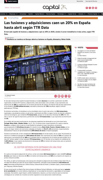 El mercado español de fusiones y adquisiciones cayó un 20% en 2025, siendo el sector inmobiliario el más activo, según TTR Data.