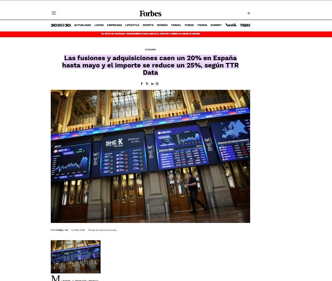 Las fusiones y adquisiciones caen un 20% en España hasta mayo y el importe se reduce un 25%, según TTR Data