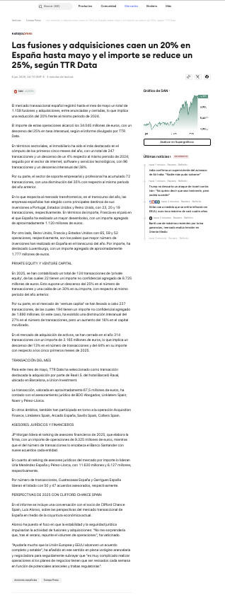 Sobre su relación con TTR Data, ha señalado: “Es una fuente valiosa de inteligencia de mercado. Nos ayuda a contextualizar nuestras operaciones y anticipar movimientos del mercado. Muy recomendada para asesores y equipos jurídicos que trabajan en M&A y quieren estar al tanto de las principales tendencias y nuevas oportunidades”.