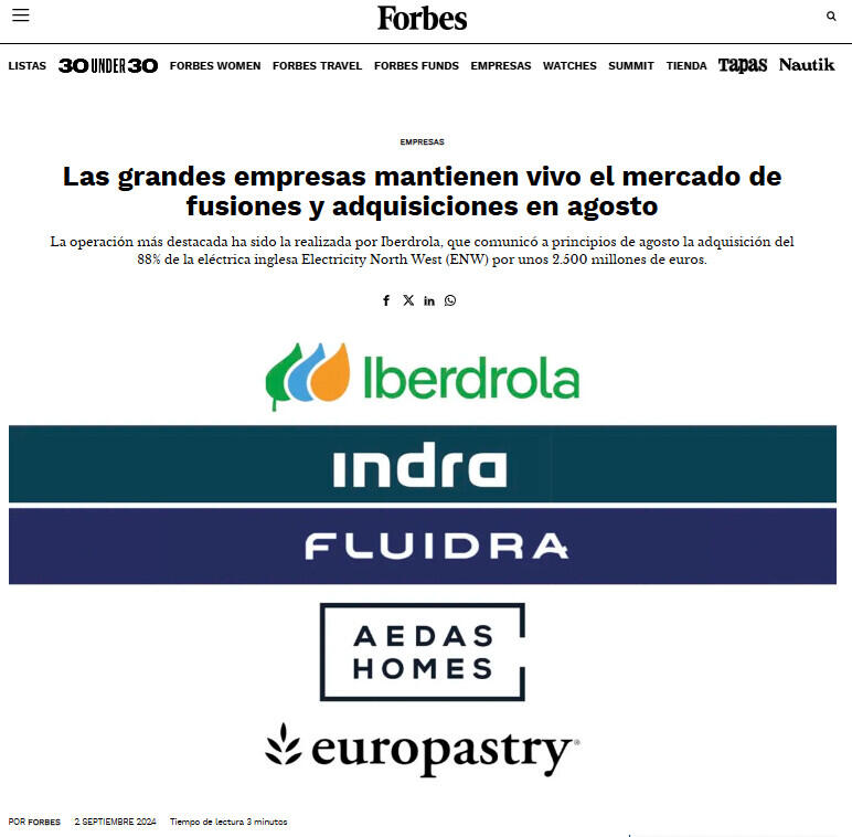 Empresas como Iberdrola, Indra, Fluidra, Aedas Homes o Europastry han continuado esta tendencia en agosto, animando el mercado con el anuncio de nuevas adquisiciones a lo largo del mes, según publica Servimedia.