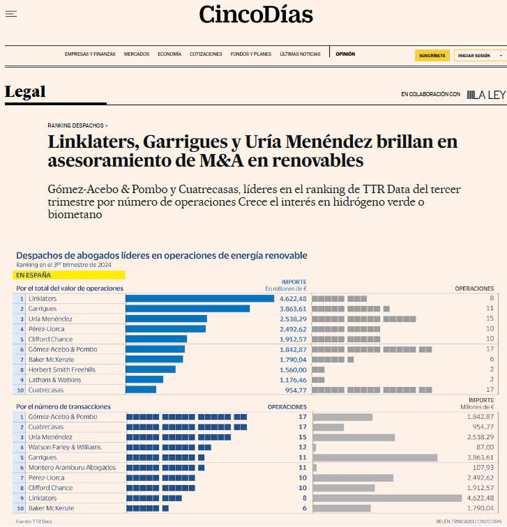 Gómez-Acebo & Pombo y Cuatrecasas, líderes en el ranking de TTR Data del tercer trimestre por número de operaciones Crece el interés en hidrógeno verde o biometano