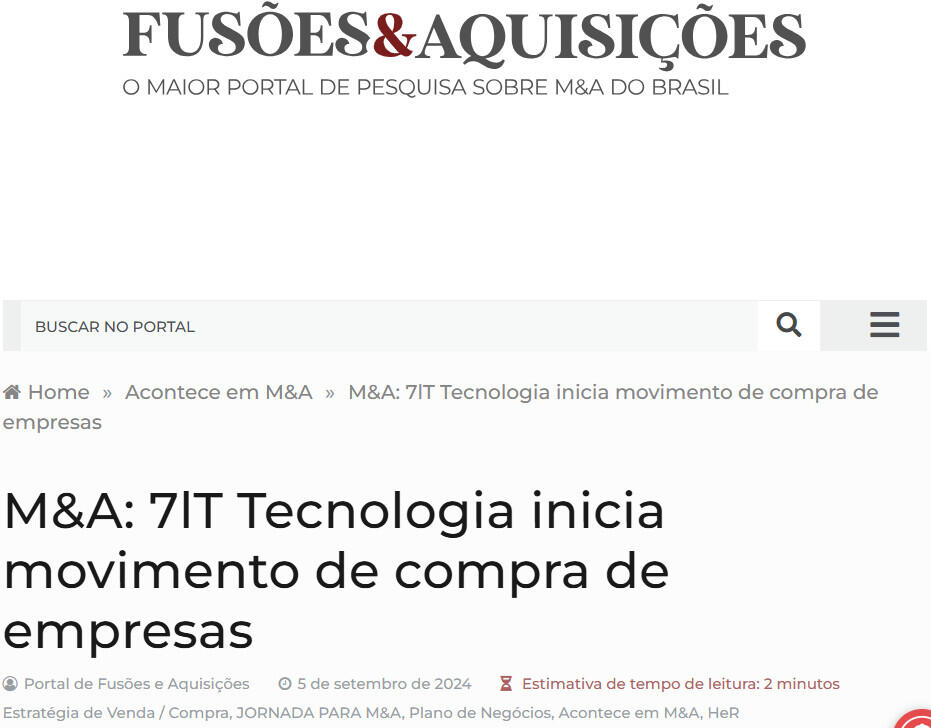 A 7IT Tecnologia, empresa que presta serviços e produtos de tecnologia para o segmento B2B, deu início a uma nova fase de análise e exploração de oportunidades no mercado de tecnologia. O objetivo é identificar empresas que possam complementar suas capacidades e ampliar sua oferta de soluções, conforme informação divulgada pelo CEO da empresa, Protta.