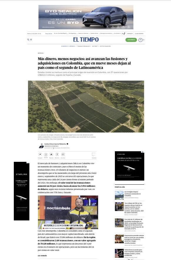 “Colombia está consolidándose como un mercado atractivo y sofisticado, con operaciones más estructuradas y un interés sostenido del capital extranjero”, afirmó Carlos Dorado, líder de fusiones y adquisiciones y transacciones para Sudamérica hispana en Aon.