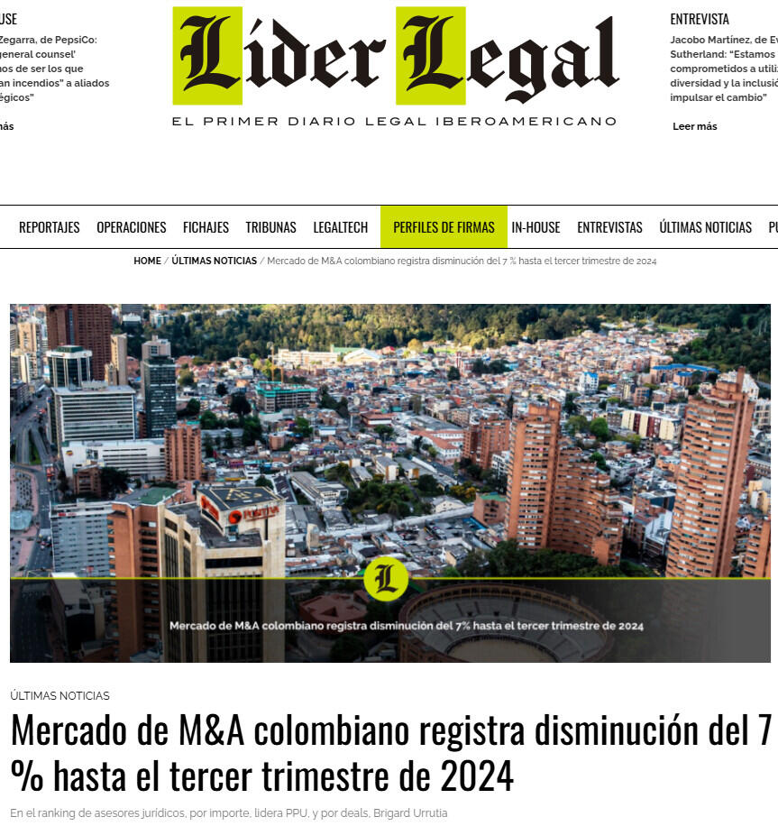 En el ranking TTR de asesores jurídicos, por importe, lidera Philippi Prietocarrizosa Ferrero DU & Uría Colombia, con 1.567 millones de dólares. Y, por número de deals, lidera Brigard Urrutia, con 23 transacciones.