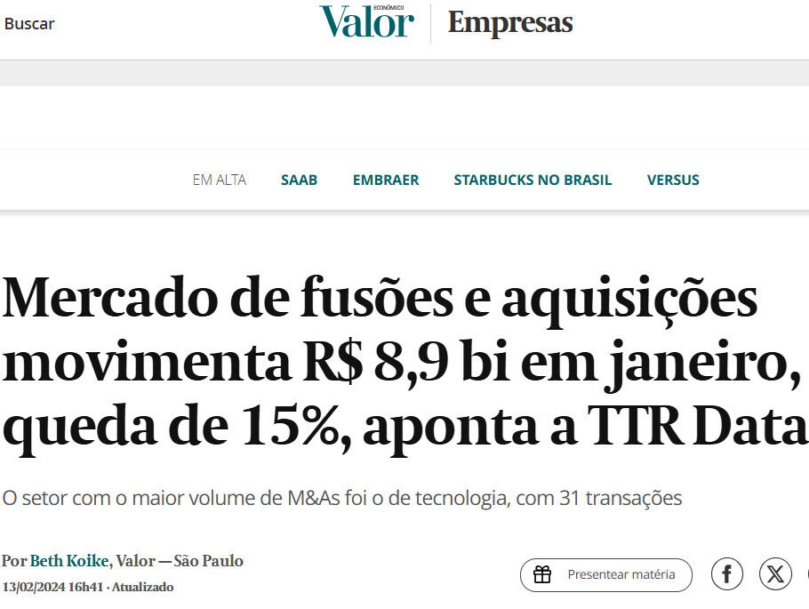 Mercado de fusões e aquisições movimenta R$ 8,9 bi em janeiro, queda de 15%, aponta a TTR Data