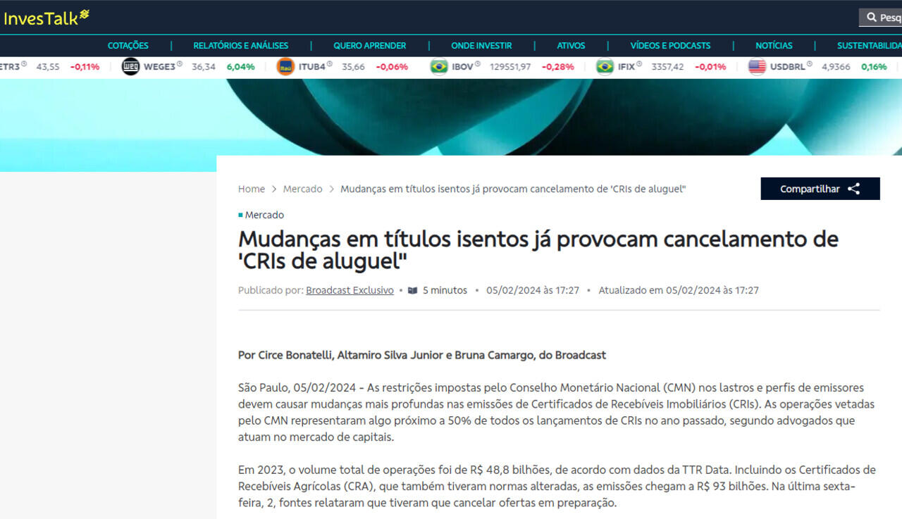 "Com certeza o impacto será grande para o setor de dívida corporativa. Tinha bastante empresa fora do setor imobiliário aproveitando a concessão da CVM para emitir 'CRIs de aluguel'. Era visto como um funding mais barato", diz. "Algumas operações que estavam sendo estruturadas certamente precisarão ser revistas daqui para frente."