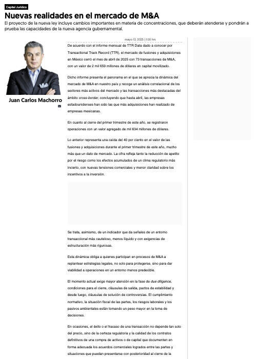 El mercado de fusiones y adquisiciones en México no se ha detenido, pero sí se ha sofisticado. La confianza ya no se gana solo con el tamaño de la inversión, sino con la solidez jurídica de su ejecución.