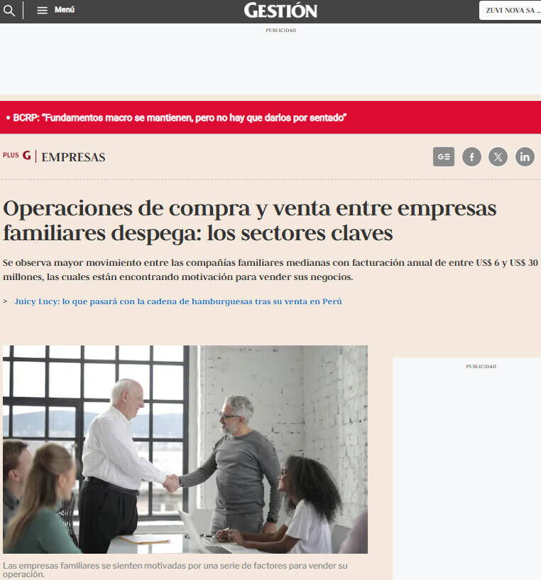 Martin Reaño Azpiluceta, Socio en Reaño & Linares Asesores Financieros, indica que se está observando un mayor movimiento en operaciones de compra y venta en las empresas familiares medianas que facturan entre US$ 6 millones y US$ 30 millones al año. Esto se debe a que compañías globales y fondos de inversión han puesto la mirada a este tipo de firmas, las cuales también han comenzado a salir de sus negocios.