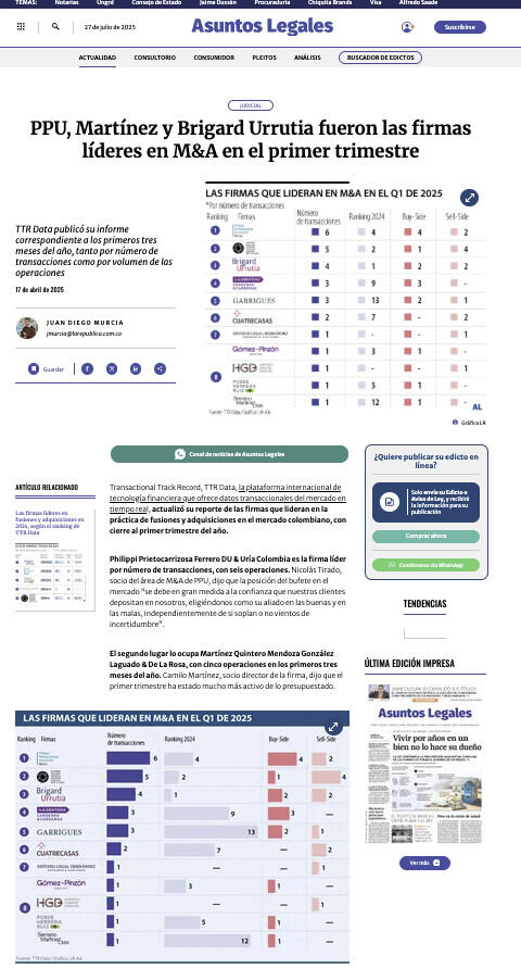 Transactional Track Record, TTR Data, la plataforma internacional de tecnología financiera que ofrece datos transaccionales del mercado en tiempo real, actualizó su reporte de las firmas que lideran en la práctica de fusiones y adquisiciones en el mercado colombiano, con cierre al primer trimestre del año.