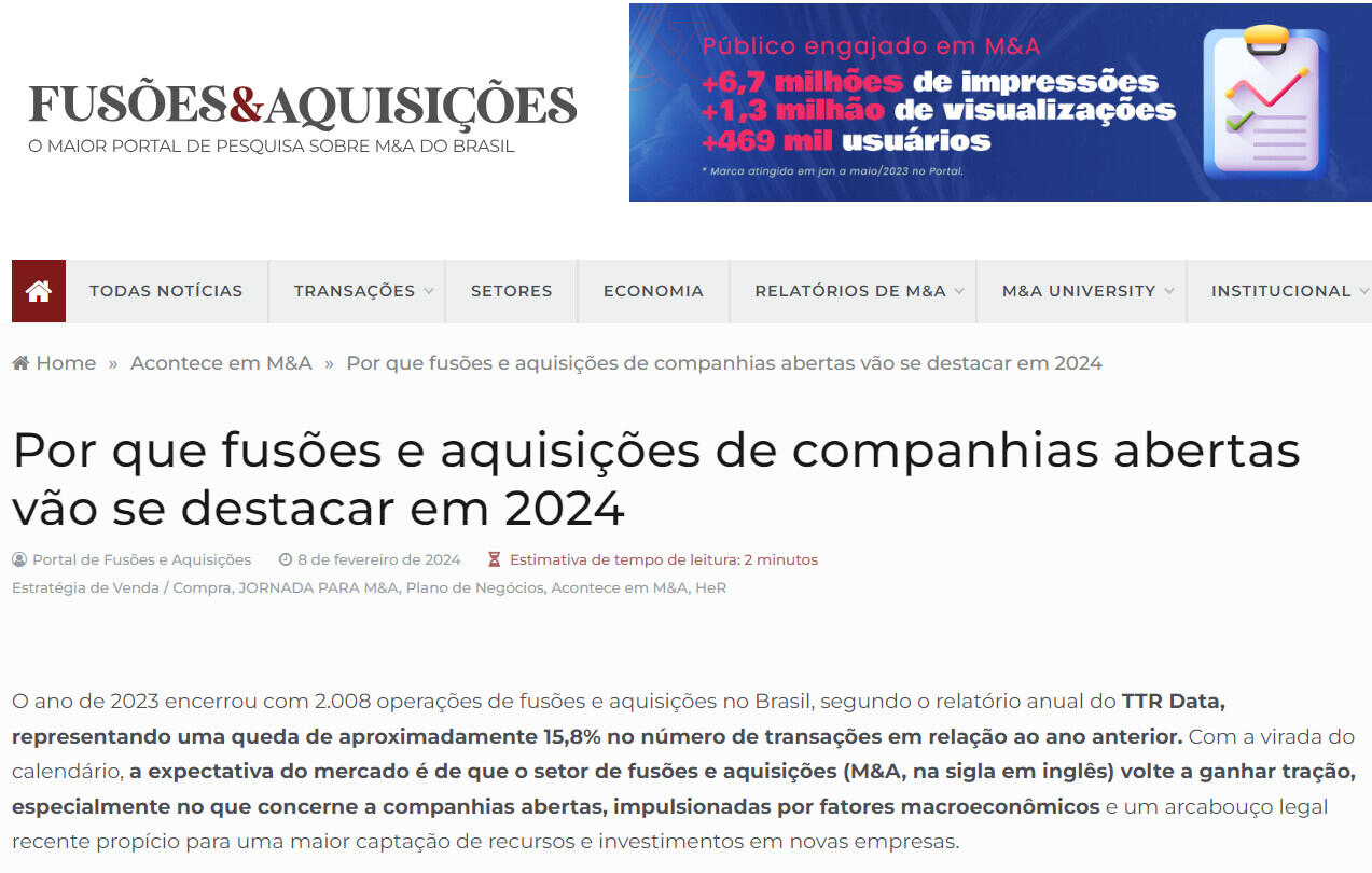 O ano de 2023 encerrou com 2.008 operações de fusões e aquisições no Brasil, segundo o relatório anual do TTR Data, representando uma queda de aproximadamente 15,8% no número de transações em relação ao ano anterior. Com a virada do calendário, a expectativa do mercado é de que o setor de fusões e aquisições (M&A, na sigla em inglês) volte a ganhar tração, especialmente no que concerne a companhias abertas, impulsionadas por fatores macroeconômicos e um arcabouço legal recente propício para uma maior captação de recursos e investimentos em novas empresas.