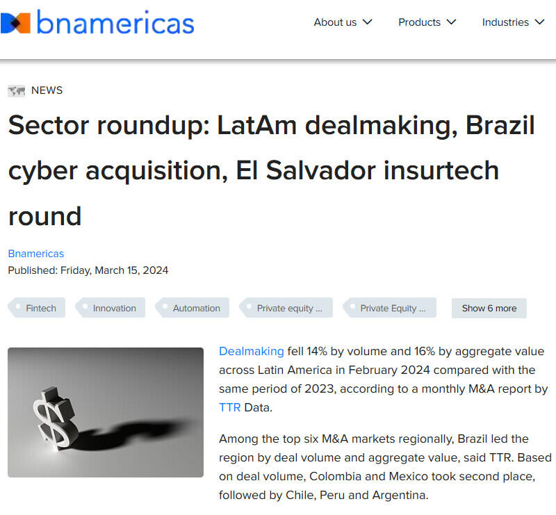 Dealmaking fell 14% by volume and 16% by aggregate value across Latin America in February 2024 compared with the same period of 2023, according to a monthly M&A report by TTR Data.