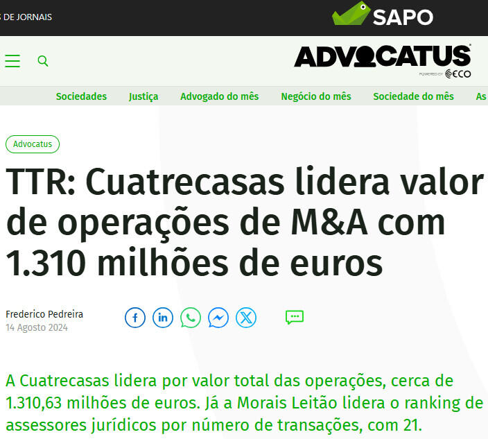 A Cuatrecasas lidera por valor total das operações, cerca de 1.310,63 milhões de euros. Já a Morais Leitão lidera o ranking de assessores jurídicos por número de transações, com 21.
