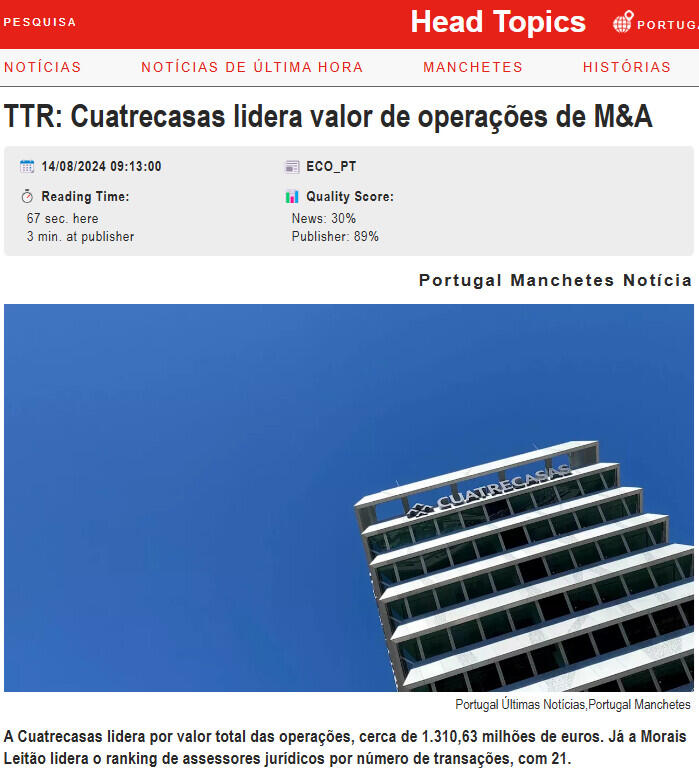 A Cuatrecasas lidera por valor total das operações, cerca de 1.310,63 milhões de euros. Já a Morais Leitão lidera o ranking de assessores jurídicos por número de transações, com 21.