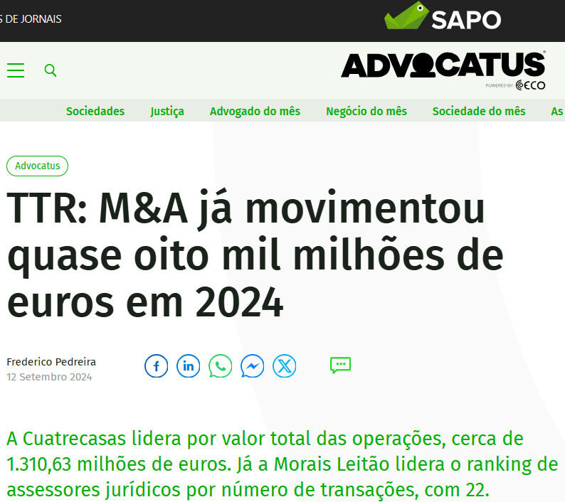 O recente ranking do TTR Data, que analisa o período entre 1 janeiro a 31 de agosto de 2024, revela quais foram os principais escritórios de advogados e legal advisors, nas principais operações de M&A, Venture Capital, Private Equity e Asset Acquisition. A Cuatrecasas lidera por valor total das operações, cerca de 1.310,63 milhões de euros. Já a Morais Leitão lidera o ranking de assessores jurídicos por número de transações, com 22.