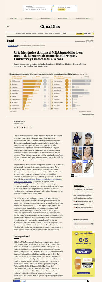 Uría Menéndez domina el M&A inmobiliario en medio de la guerra de aranceles; Garrigues, Linklaters y Cuatrecasas, a la caza