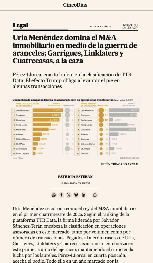 Uría Menéndez se corona como el rey del M&A inmobiliario en el primer cuatrimestre de 2025. Según el ranking de la plataforma TTR Data, la firma liderada por Salvador Sánchez-Terán encabeza la clasificación en operaciones asesoradas en este mercado, tanto por volumen como por número de transacciones. Pegados al alerón trasero de Uría, Garrigues, Linklaters y Cuatrecasas arrancan con fuerza en este primer tramo del ejercicio, manteniendo el ritmo en la lucha por los laureles. Pérez-LLorca, en cuarta posición, acecha el podio. Todo ello en un año marcado por la incertidumbre global derivada del efecto Trump y la escalada arancelaria.