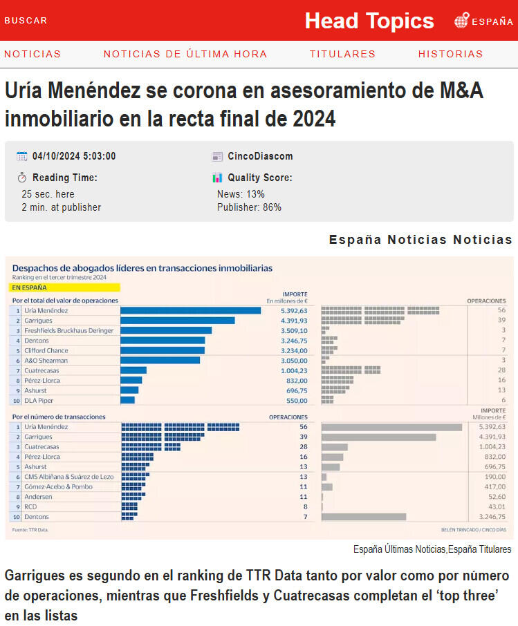 Uría Menéndez se corona en asesoramiento de M&A inmobiliario en la recta final de 2024