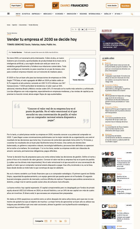 Por lo tanto, si usted piensa vender su empresa en 2030, necesita conocer a su potencial comprador en 2029. Y para llegar a esas conversaciones preliminares con la mejor versión de su organización, eso será el resultado de las decisiones que tome hoy. Un proceso de venta bien ejecutado toma entre 9 y 18 meses, y cosechar los resultados de un buen plan fácilmente toma 24 meses. Una cartera de clientes bien balanceada, un gobierno corporativo robusto, tecnología habilitante y procesos bien definidos no aparecen de la noche a la mañana. Se construyen. Y si no los tiene, vender su empresa vendrá con cláusulas de amarre: earnouts, permanencias obligatorias, pagos diferidos.