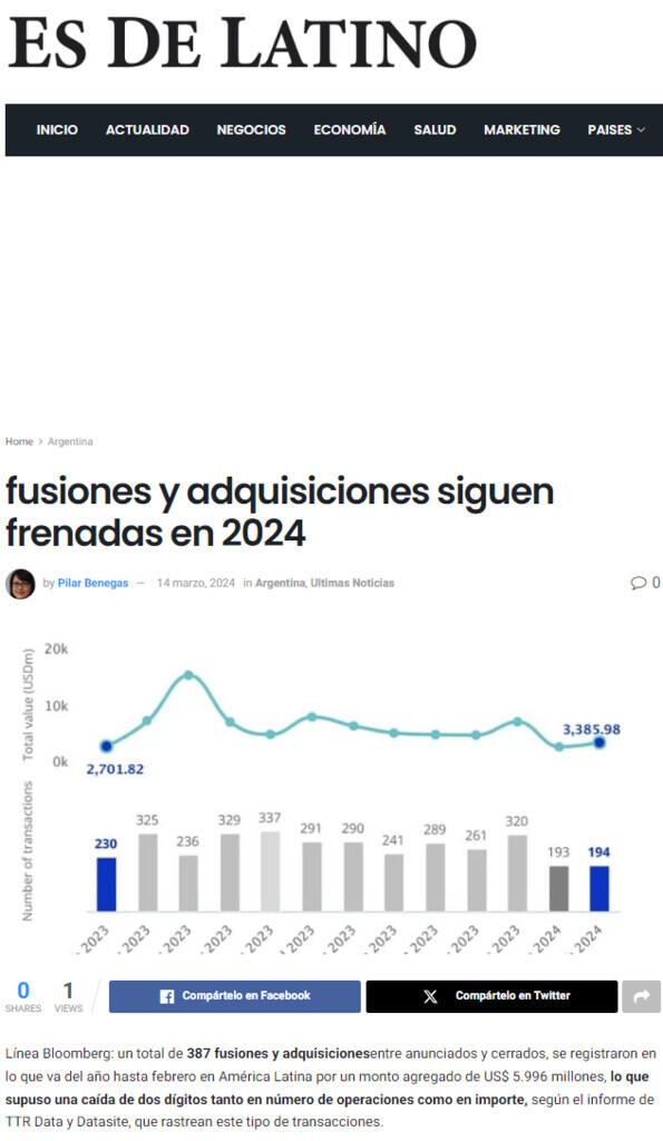 Línea Bloomberg: un total de 387 fusiones y adquisiciones entre anunciados y cerrados, se registraron en lo que va del año hasta febrero en América Latina por un monto agregado de US$ 5.996 millones, lo que supuso una caída de dos dígitos tanto en número de operaciones como en importe, según el informe de TTR Data y Datasite, que rastrean este tipo de transacciones.