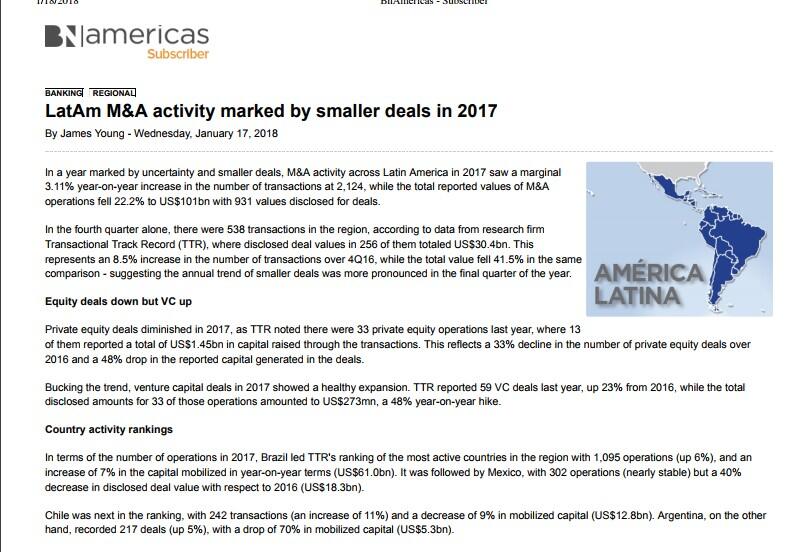 In a year marked by uncertainty and smaller deals, M&A activity across Latin America in 2017 saw a marginal 3.11% yearonyear increase in the number of transactions at 2,124, while the total reported values of M&A operations fell 22.2% to US$101bn with 931 values disclosed for deals.